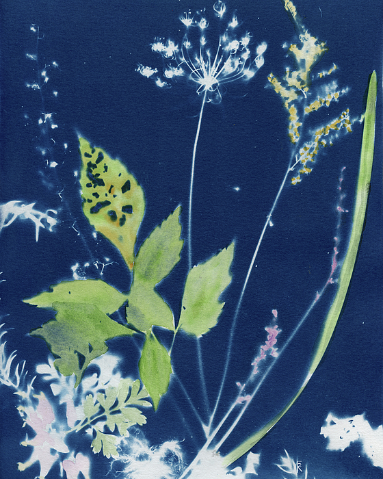 This symphony of blossoms includes: Queen Anne's Lace, Goldenrod, Smartweed, and Bleeding Heart, to name a few. Created using the cyanotype process and washed with watercolor pigments.